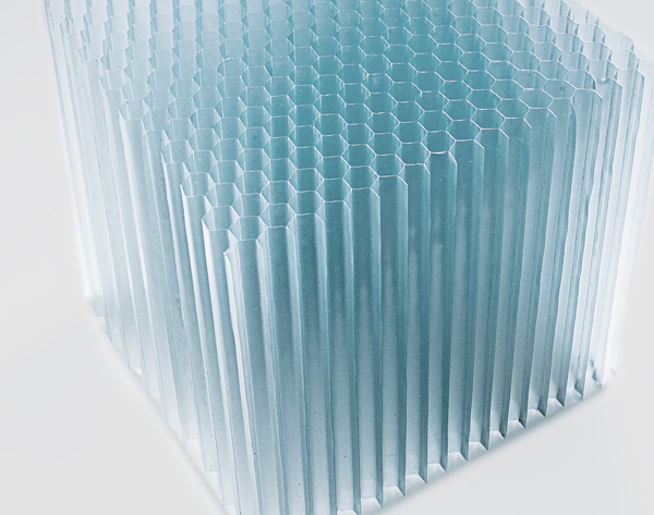 ハニコーム-Vは、硬質の塩化ビニールフィルムを特殊な技術を用いて、均一な六角形の集合体(蜂巣状)に連続成型積層したものです。その優れた形状を利用して、流体の整流、水処理用の接触材、傾斜管など、幅広く使用されています。