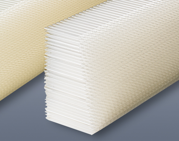 ■厚さ60μmの薄いポリプロピレン(PP)フィルムを使用したコルゲートハニカムです。面積比で95〜99%の開孔率があり、圧力損失(通気抵抗)が小さく、整流作用に優れています。